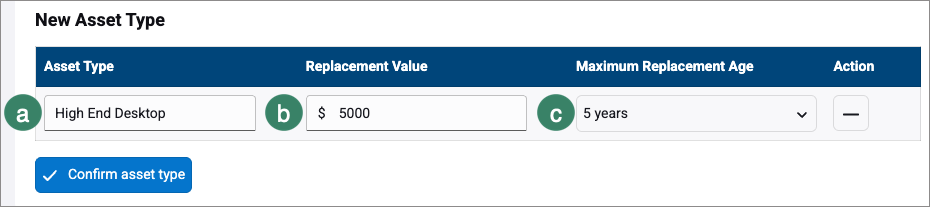 - Click Confirm asset type to add this type to the list, or click the - icon in the action column to cancel.