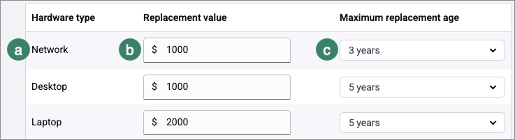 The average cost to replace that type of hardware. This value is used in budgeting and reporting. -