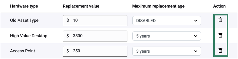 The Hardware settings page is where you manage asset types used in Lifecycle Manager reporting. You can add custom asset types, set replacement values, and choose which data appears in Hardware Lifecycle reports.