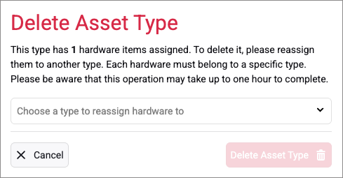 - If any hardware items have been assigned the hardware type you are trying to delete, you'll be prompted to reassign them to a new hardware type:
