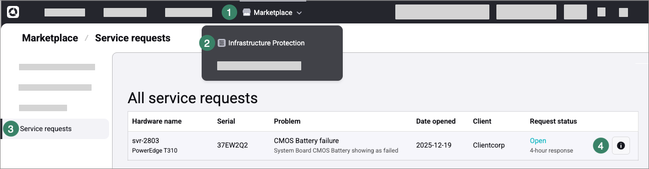 Marketplace > Infrastructure Protection > Service requests, then click the ‘i’ icon next to the open request: