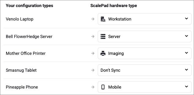 - Choose an appropriate ScalePad hardware type that aligns with the configuration type syncing from your integration:
