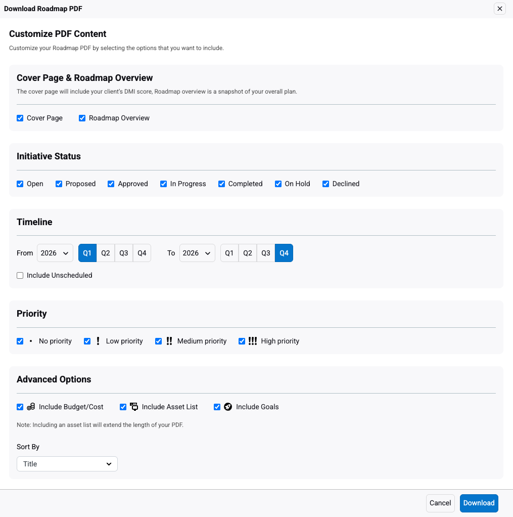 - Sort By: Choose how to sort the initiatives in the PDF (e.g., by Title).