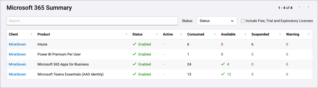 - Here, you’ll see an at-a-glance report showing how many licenses are available, how many are consumed, and how many are suspended. This overview is ideal for quickly identifying trends and potential licensing shortfalls across multiple clients.