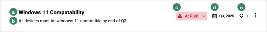 Each Goal displayed in the timeline can be identified by its title and summary. The status, target date, and number of initiatives associated with the goal are also shown.
