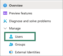 - In the left navigation menu expand the Manage section and click Users, then click the name of the user created in step 1 to open the user overview.