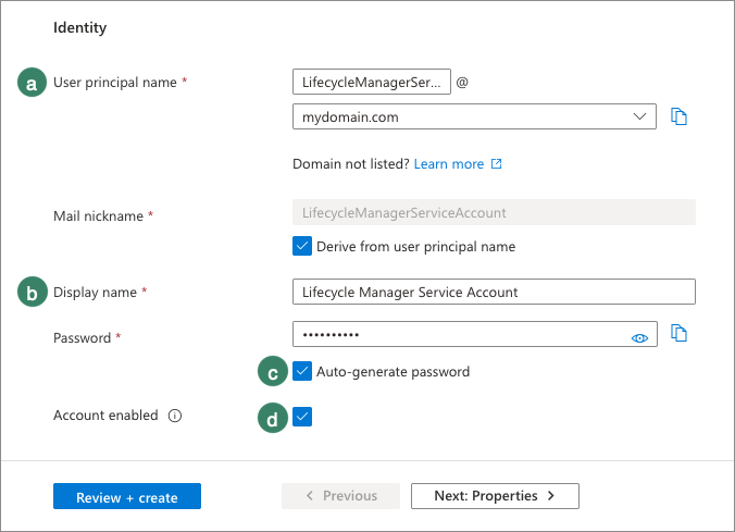 - User principal name (for example, LifecycleManagerServiceAccount)
